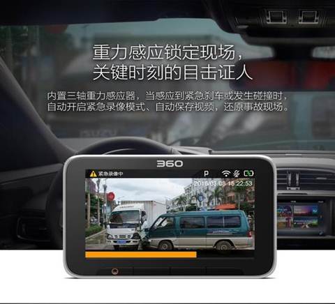 为了打造安全的行车体验,在360行车记录仪美猴王版,后视镜版等几个版本中皆配备了停车监控和重力感应功能。即使车主不在身边,360行车记录仪依然保持开启状态,如果车体遭受碰撞,记录仪便会立即开启监控录像,是无人值守的监控卫视。另外,行车期间如果遇到紧急刹车或意外碰撞,360行车记录仪会也会灵敏感应,自动开启重力感应模式,进行紧急录像并自动保存视频,还原事故现场。